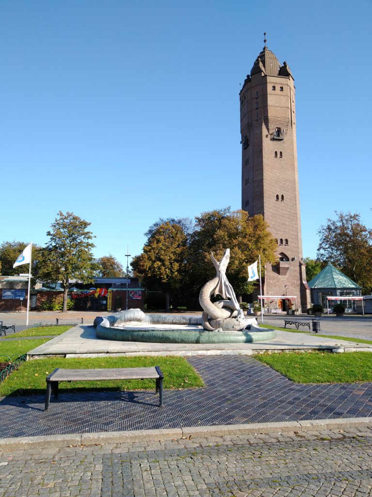 Pokud přijedete vlakem, jízdenky se dají koupit v aplikaci Skånetrafiken, vystoupíte na krásném nádraží hned vedle přístavu, kde probíhá čilý ruch po celý rok. Do Trelleborgu jezdí trajekty z Německa, Polska i Litvy a je to tak ideální místo k objevování pobaltí. Moje kroky však zamířili směrem od moře do středu města. Vzhledem k tomu, že jsem město navštívil v sobotu, ještě k tomu v říjnu, bylo absolutně mrtvé. Turistické centrum má otevřeno jen ve všední dny, praktické, a ze všech obchodů a restaurací jsou otevřeny jen ty drahé na hlavním náměstí a nebo největší supermarkety. Na náměstí se nachází jedna ze dvou dominant města, vodárenská věž s fontánou ve tvaru draka, která je poměrně impozantní, na tak malé město. V přízemí vodárenské věže je kavárna, bistro, kde je možná dát si něco malého k snědku a k pití a já ho doporučuji k zastávce, bohužel nic lepšího v Trelleborgu podle mého průzkumu, aspoň na podzim, otevřeného není.